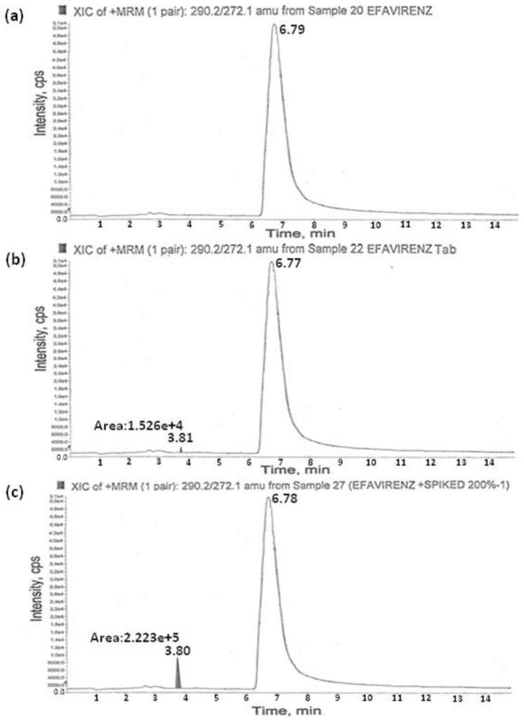 Typical chromatograms of the (a) efavirenz drug substance (b), efavirenz tablet, and (c) accuracy of AMCOL.