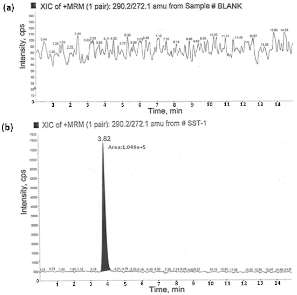 Blank chromatogram (a) and typical chromatogram (b) of AMCOL at the 2.5 ppm level. XIC: Extracted ion chromatogram; MRM: Multiple reaction monitoring; amu: atomic mass unit; SST-1: System suitability solution-1.
