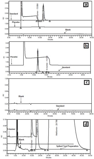 It was observed that there was no interference at the retention time (RT) of the S-isomer due to a diluent blank, placebo and eight degradation products of the LGP and Met HCl. Chromatograms are shown in Figure 6.