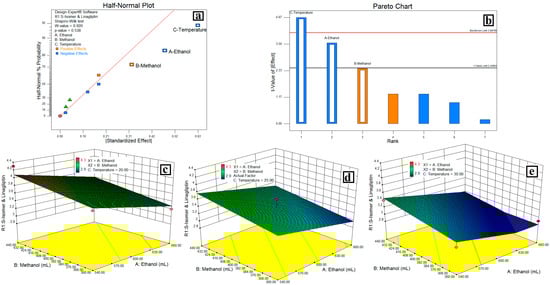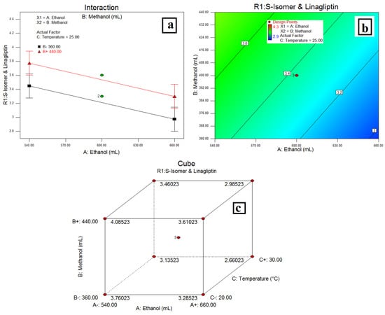In the half-normal plot, large effects (absolute values) appear in the upper-right section of the plot, i.e., the column oven temperature (C) has a more significant effect on R1 followed by the volume of EtOH (A) and the volume of MeOH (B) respectively. In the pareto chart, effects above the Bonferroni limit were almost certainly significant, while effects above the t-value limit were possibly significant. This indicates that column oven temperature, followed by the volume of EtOH (A) and the volume of MeOH (B) were more significant than other factors on R1, the negative effect of temperature and the volume of EtOH. The positive effect of the volume of MeOH from the pareto chart indicates that a decrease in column oven temperature and the volume of EtOH, and an increase in % or volume MeOH increases the resolution between the S-isomer and the LGP increases. The same was confirmed with an interaction plot (Figure 3a). Further the 3D plots (Figure 2c–e) show a linear effect of column oven temperature and the volume of EtOH (as a pareto chart) on the resolution between the S-isomer and the LGP-(R1). Also, a desirability plot and cube (Figure 3b,c) shows that a decrease in column oven temperature and the volume of EtOH will increase the resolution and predicted the resolution of 3.0 between the S-isomer and LGP-(R1); it was optimum for the applied method conditions.