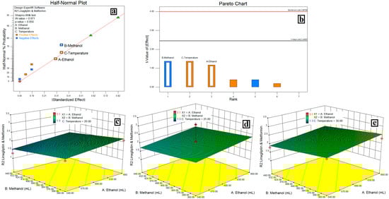 Relation between variables on resolution of LGP and MET HCl (a) Half-Normal Plot; (b) Pareto Chart; (c, d and e) 3D Plots showing the linear effect of temperature with volume of EtOH from mobile phase.
