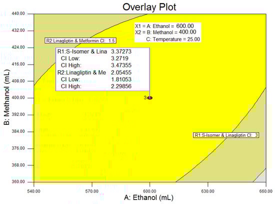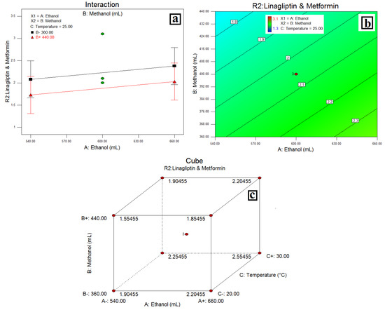 In a half-normal plot, the large effects (absolute values)—the volume of MeOH (B) and column oven temperature (C)—have a more significant effect on R2 followed by %EtOH (A). A pareto chart indicates column oven temperature, followed by the volume of EtOH (A) and the volume of MeOH (B) were more significant than other factors on R2, but these effects were below the t-value limit and possibly significant. A negative effect of the volume of MeOH and a positive effect of column oven temperature and the volume of EtOH indicates that a decrease in the volume of MeOH and an increase in column oven temperature and the volume of EtOH increases the resolution between LGP and MET increases. The same was confirmed with an interaction plot (Figure 5a). Further, the 3D plots (Figure 4c–e) show a linear effect of column oven temperature and the volume of EtOH (as a pareto chart) on resolution between LGP and MET. Also, a desirability plot and cube (Figure 5b,c) shows that a decrease in the volume of MeOH and an increase in column oven temperature and the volume of EtOH will increase the resolution and predicted the resolution at about 2 between LGP and MET-(R2); it was optimum for the applied method conditions.