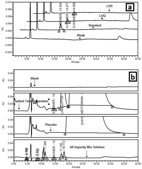 (a) Overlaid chromatogram of blank, standard, limit of detection (LOD) and limit of quantitation (LOQ); (b) Overlaid chromatogram of a blank, S-isomer spiked test preparation, placebo/matrix, LGP and MET HCl impurity mix solution.