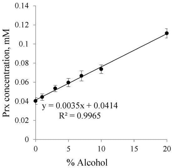 The solubility of Prx was measured as a function of ethanol concentration up to 20%. Briefly, an excess amount of Prx was accurately weighed and placed into the glass screwed cap bottle. The appropriate volume of ethanol and water was added to obtain varying percentages of ethanol: 1%, 3%, 5%, 7%, 10% and 20% by volume respectively. The bottles were sonicated using ultrasonic cleaner (Elma, Singen, Germany) of 50 kHz for a few minutes to ensure homogeneity of the mixtures and then placed on the magnetic plate (Variomag®, Thermo Fisher Scientific, Waltham, MA, USA). The mixture was stirred using a small magnetic bar at 150 rpm for 48 h in a thermostatic incubator with temperature controlled at 25 ± 0.1 °C. The mixture was then passed through a 0.45 μm membrane filter to obtain a clear filtrate. The filtrate was diluted if necessary and the absorbance was measured at 359 nm using a UV-spectrophotometer (UV-2450). The absorbance was converted into Prx concentrations using the calibration curve. The influence of ethanol on Prx solubility was assessed by plotting the concentration of Prx against the percentage of ethanol. The results were obtained using Yalkowsky and Roseman’s logarithmic—linear model [24].