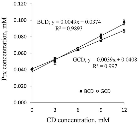 Phase solubility diagrams of Prx-CD inclusion complexes; ● β-CD (BCD) and ○ γ-CD (GCD). CD: cyclodextrin.