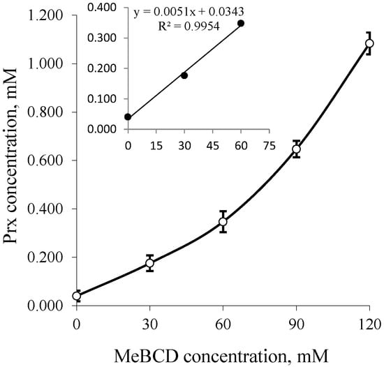 Phase solubility diagrams of Prx–MeBCD inclusion complexes; Insert: Up to 0–60 mM of MeBCD. MeBCD: 2,6-dimethylated-β-CD.