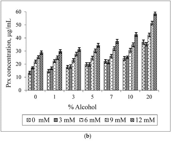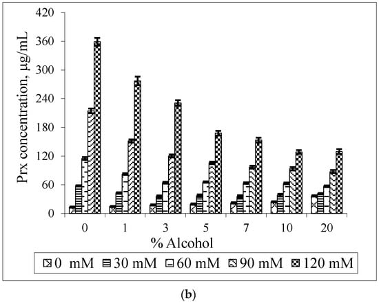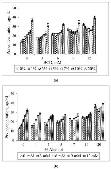 Figure 5 illustrates the bilateral effect of BCD and ethanol on the Prx solubility. It is shown that the Prx solubility increases linearly in the binary system (when either BCD or ethanol is absent). However, as shown in Figure 5a, the increase in the percentage of ethanol does not enhance the drug solubility at every BCD concentration. This synergistic effect, the increase in the Prx solubility upon rising the ethanol percentage, is only observed at low concentrations of BCD i.e., 3 mM. At the slightly higher BCD concentration of 6 mM, instead of being further increased, the drug solubility is unaltered by the increase in ethanol percentage up to 7%. Two explanations for this co-solvent effect can be given: firstly, ethanol is less polar than water; it can compete with the drug to occupy the BCD’s cavity. This was supported by the molecular dynamics study demonstrating the interaction between BCD and ethanol [21,22]. Instead of dissolving the non-complexed drug only, the ethanol molecule forms an inclusion complex with BCD. Secondly, BCD has a relatively low water solubility of 1.85 g/100 mL, which is equivalent to 16.3 mM and is practically insoluble in ethanol [24]. Both effects led to the destabilization of Prx–BCD complexes. This is confirmed by the decrease in the k1:1 values, as shown in Table 2. Thus, no change of the drug solubility is due to a balance between the promoting and destabilizing effect of both BCD and ethanol.