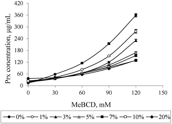 Effect of ethanol on the solubility of Prx in Prx–MeBCD–ethanol ternary mixtures varying MeBCD concentrations.