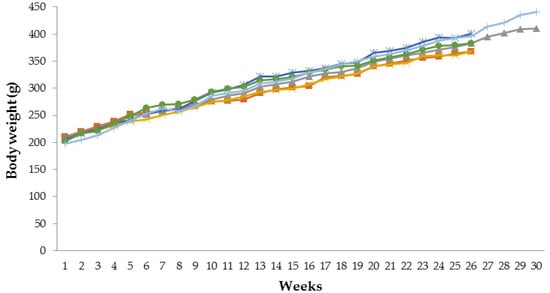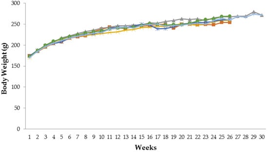 Figure 1 and Figure 2 show the body weight profiles of male and female rats for six months of tamarind pulp extract administration. There was no significant difference in the body weight profile of the test group compared to the control group (p > 0.05). However, the body weights of the male rats in the satellite 1000 mg/kg bw group were significantly increased (p < 0.05) in week 30 compared to the satellite control group (440.70 ± 38.90 g vs. 410.25 ± 54.68 g).
