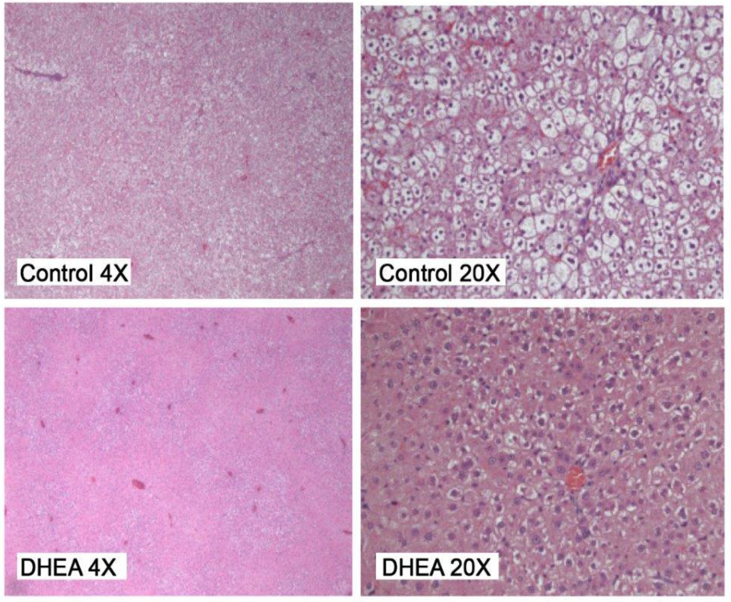 Liver steatosis: obese control shows marked steatosis, original magnification 4× and 20×. Obese DHEA shows less steatosis, original magnification 4× and 20×.