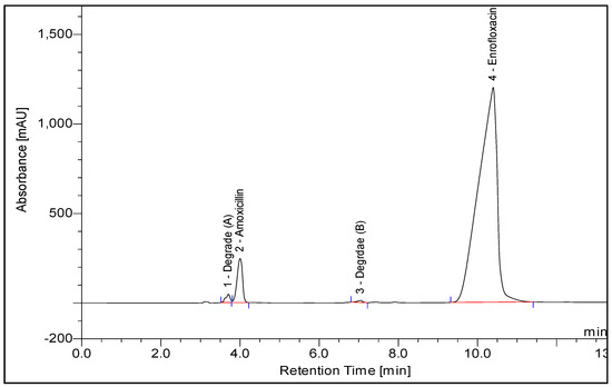 Preliminary studies involved trying different stationary phases and testing several mobile phase compositions for the effective separation of amoxicillin and enrofloxacin. Method development started with testing three reversed-stationary phases (C4, C8, and C18 columns). Both analytes have retention using all these stationary phases, but for good separation of the two analytes and the degradation products as shown in Figure 2, stationary phase C18e (250 mm × 4.0 mm, 5 μm) was found to be the best one for optimum separation, as shown in Figure 2. Regarding the mobile phase, a mixture of acetonitrile and phosphate buffer containing methanol at pH 5.0 was tested both in isocratic and gradient elution. Isocratic elution was not successful for the separation of the two analytes and the degradation products even when using a high percentage of buffer. Therefore, the gradient elution was used and optimized as reported in Section 2.3. Regarding the pH of the buffer, different pH values were tested and we found that pH 5 was the best as it gave a better separation of the two analytes and degradation products. Different flow rates of 1.2, 1.0, and 0.8 mL/min were tested, and we found that 0.8 mL/min was the best one. Room temperature was good for this separation and so it was used in the whole separation. Ultraviolet detection at 267 nm was used as it was found to be the optimum wavelength for the two analytes (amoxicillin and enrofloxacin) as it gave a high signal-to-noise ratio and a high peak area for the two analytes. Using these conditions, good separation of the two analytes and the degradation products was obtained (see Figure 2), and the diluent and placebo (mixture of excipients) did not show a response in the region of the analytes.