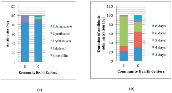 Use of antibiotic in the treatment of acute pharyngitis patients: (a) Antibiotic that was prescribed; (b) Duration of antibiotic administration; B: health center in Bandung; C: health center in Cimahi.