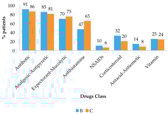 The health centers in Bandung and Cimahi showed the same prescribing pattern. At least 50% of acute pharyngitis patients were treated with a combination of antibiotics, analgesic-antipyretic, expectorant-mucolytic, and antihistamines (Figure 2). Symptomatic drugs prescribed include corticosteroids (dexamethasone: 24.92%, prednisone), analgesic-antipyretics (paracetamol: 82.55%, antalgin), expectorants-mucolytics (glyceryl guaiacolate: 37.19%, ambroxol, black cough syrup), antihistamine (chlorpheniramine maleate: 54.55% loratadine), nonsteroidal anti-inflammatory drugs (NSAIDs) (diclofenac: 3.22%, ibuprofen, mefenamic acid, piroxicam), antacid-antiemetics (antacid: 10.24%, domperidone, metoclopramide), vitamins (B complex: 10.31%, C, B1, B6, B12, multivitamin).