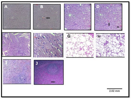 Histopathological examination of various organs of the rat in acute oral toxicity study; (A,C,E,G,I) are liver, kidney, heart, lung, and spleen of the control group; (B,D,F,H,J) are liver, kidney, heart, lung, and spleen of the treated group. (B) A hydrophobic degeneration along with mild congestion in portal vein (arrow); (D) mild congestion in intertubular blood vessels(arrow); (F) normal myocardium; (H) normal lung; and (J) mild congestion in red pulp (arrow). (Haematoxylin & Eosin, (H&E) ×100).