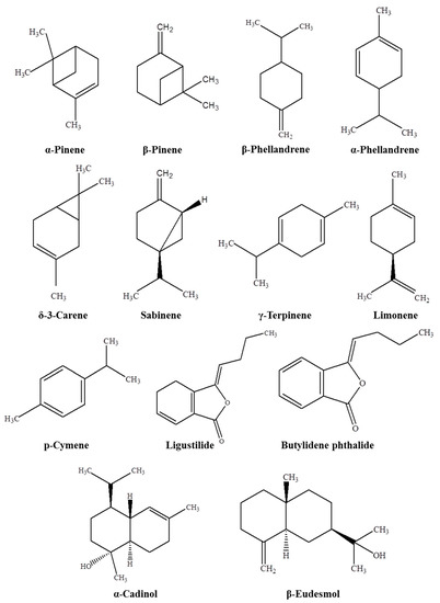 The main aim of this review is to offer an overview on the chemical composition of EOs from different species of Angelica growing in various countries. Table 1 shows the plant name, plant parts, extraction methods, yield, and the major components of EOs in relation to different species of Angelica. The published reports revealed that the EOs of the genus Angelica isolated by steam distillation or the hydrodistillation method mainly consist of monoterpene hydrocarbons. Figure 1 depicts the chemical structure of some of the major components of EOs from Angelica species.