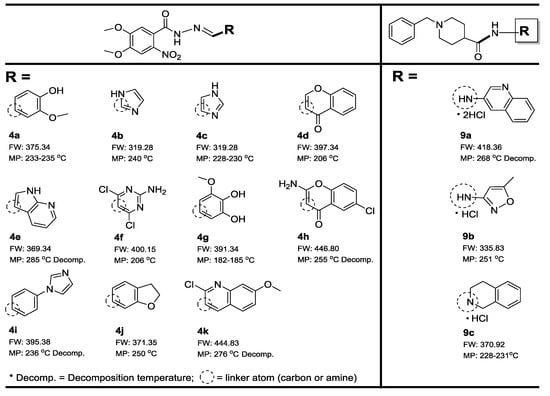 Structures of the synthesized hydrazones (4a–k) and isonipecotates (9a–c). Note that FW means Formula Weight and MP denotes Melting Point.