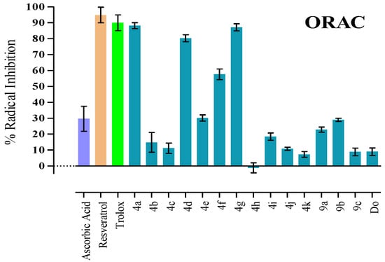 where f0 is the measured fluorescence intensity at time 0 and fi is the measured fluorescence intensity at time i. The ORAC assay percent radical scavenging activities are reported in Figure 2.