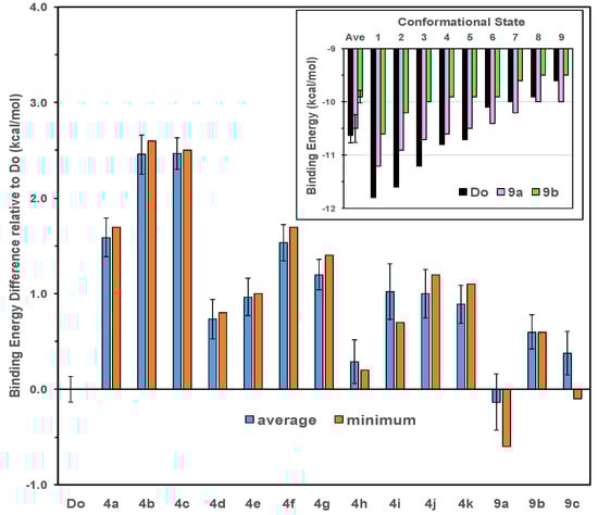 Summary of binding energies obtained for all compounds reported herein including comparative conformations of Do versus compounds 9a and 9b.