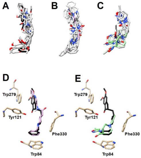 Computational binding of compounds at acetylcholinesterase (AChE). (A–C) represent the nine predicted conformations while (D,E) refer to the lowest energy binding orientations obtained by docking.