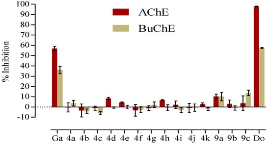 Measurements were run on multiple plates, in triplicates. The substrates acetylthiocholine and butyrylthiocholine were cleaved by their respective enzymes, generating thiol groups detected via their reaction with the colorimetric Ellman’s reagent, DTNB. Initial rate measurements were performed at 37 °C using a VersaMax microplate reader with SoftMax Pro 5 software (Molecular Devices, Sunnyvale, CA, USA) and collecting absorbances at 412 nm every 15 s for 15 min. Percent inhibitions of the enzyme activity due to the presence of test compounds with respect to the control were calculated by the following expression: [(v0 − vi)/v0] × 100, where vi and v0 are the rates calculated in the presence and absence of an inhibitor. AChE and BuChE act independently to hydrolyze/deactivate acetylcholine, and their inhibition leads to enhancements in the levels and activity of ACh. Enzyme inhibition data obtained from test and reference molecules are displayed in Figure 5.