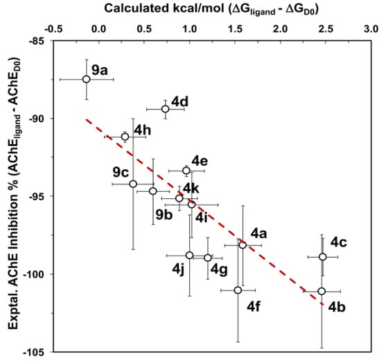In terms of cholinergic activity, most analogs poorly inhibited (<10%) AChE and BuChE. The exception was isonipecotates 9a and 9c, which modestly inhibited (10–20%) both enzymes. As expected, the reference compounds (Ga and Do) differentially inhibited AChE (almost 60% for Ga, and 98% for Do) and BuChE (by about 30% by Ga, and 60% for Do). Despite the low enzyme inhibitory activities, we were encouraged by a finding that a linear correlation existed when calculated binding free energy (kcal/mol) differences and experimentally derived % AChE binding inhibition differences were plotted, as illustrated in Figure 6. This correlation was meaningful because it confirmed that our predictive computational model for AChE binding was on the right path and implied that the designed compounds yielded useful leads whose cholinergic shortfall could be improved by SAR (structure activity studies). We now know that π-π stacking may not be the only essential SAR element for AChE/BuChE inhibition. Rather, a combination of π-π interactions plus H-bonding or polar groups may prove useful.