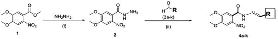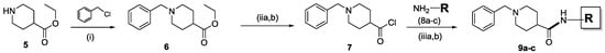 Hydrazone synthesis occurred in two steps (Scheme 1) [6,7,8]. Step one involved refluxing methyl 4,5-dimethoxy-2-nitrobenzoate 1 and excess hydrazine monohydrate in absolute ethanol, and afforded intermediate 2 in yields of 60–70%. In step two, intermediate 2 was condensed with a variety of aromatic aldehydes 3a–k to form arylated hydrazones 4a–k as solids (Figure 1, 70%-quantitative yields). Exploratory arylated isonipecotates 9a–c were prepared beginning with the trimethylamine-facilitated N-benzylation of isonipecotate ethyl ester 5 in toluene (Scheme 2) [9]. Reaction yields of the benzylated intermediate 6 were >90%. Ester hydrolysis, under basic reflux, led to the carboxylic acid intermediate, which was promptly converted to the acyl chloride 7 via the dropwise addition of SOCl2. Finally, acyl chloride treatment with appropriate amines 8a–c, in step three (Scheme 2), afforded target products 9a–c (60–75% overall yields).