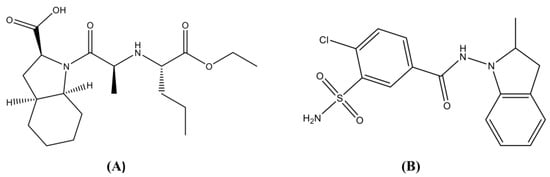 Chemical structures for (A) Perindopril and (B) Indapamide.