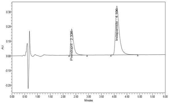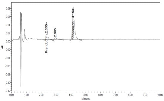 Perindopril arginine and Indapamide hemihydrate as a combination therapy was proven to have a major effect on systolic blood pressure, arterial stiffness, and microcirculatory alterations [4,5,6,7]. Thus, different studies and pharmaceutical industries are competing to produce different combinations of Perindopril arginine and Indapamide hemihydrate to keep patients’ blood pressure within an acceptable range. Coversyl Plus® (Servier, Wexham, UK) is a new pharmaceutical product that contains 5000 µg of Perindopril arginine and 1250 µg of Indapamide hemihydrate to control blood pressure in hypertensive patients [8]. Therefore, a rapid and efficient analytical method is required to qualitatively and quantitatively indicate the amounts of Perindopril arginine and Indapamide hemihydrate in its combined pharmaceutical form.