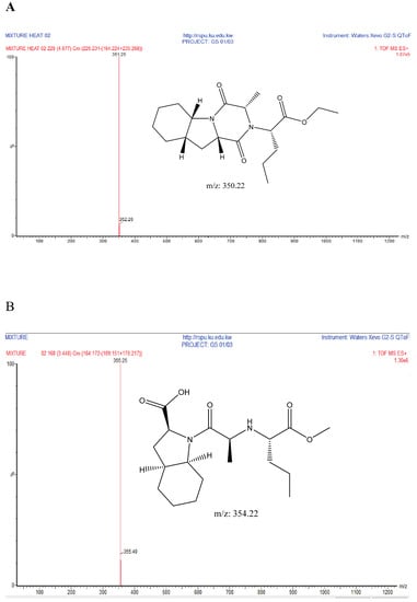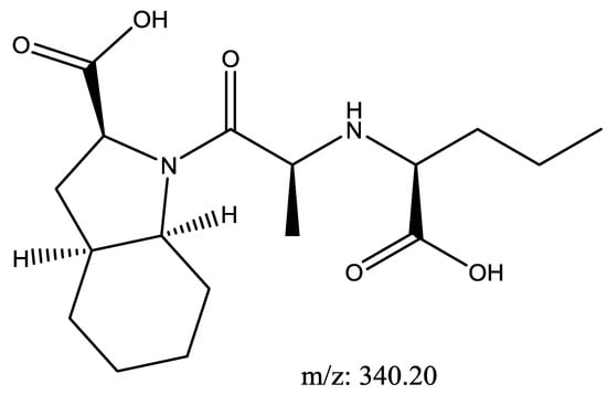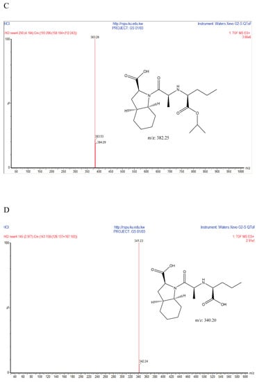 Perindopril with a molecular weight of 368.5 g/mol and Indapamide with a molecular weight of 365.8 g/mol were subjected to basic degradation by 1 N NaOH and heating at 90 °C for 90 min. Although the degradation product was below the detection limit on the UPLC-UV instrument, a Perindopril degradation product was identified and confirmed by UHPLC-QToF-MS analysis as in Figure 4 [28]. Indapamide was found to be stable towards basic degradation.
