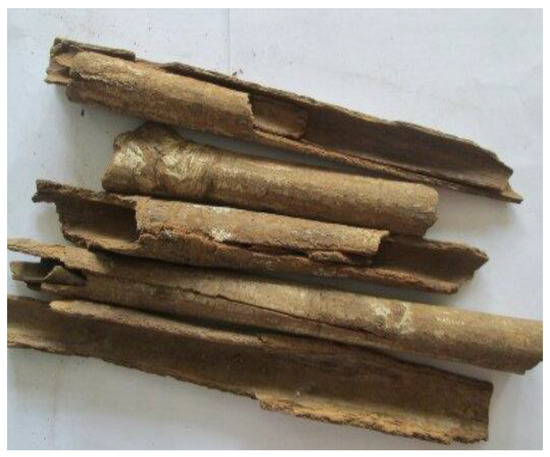 Bark samples (Figure 1) were dried in an oven at 40 °C–60 °C, powdered, and infused in accordance with the Indonesian Pharmacopoeia [6,7]. In vitro tests were performed by using dried extract (WEM) that was prepared from freeze-dried 10% infusion (10 g pulverized barks in 100 mL distilled water). Dried extract was used to make the serial dilution in RPMI medium for sample preparation in the in vitro assay. In vivo testing was performed using 20% infusion prepared fresh daily to imitate the application as traditional herbal tea 20 g pulverized barks in 100 mL distilled water. The infusion for the in vivo assay was prepared in a higher dose in order to reduce the volume of sample that was applied to the tested animal.
