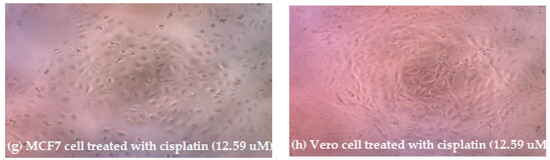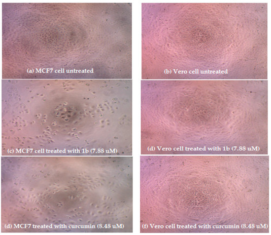 Figure 2 depict the morphological analysis of untreated MCF7 cells (a) and Vero cell (b) versus treated MCF7 and Vero cell with respect to compound 1b (7.88 µM) (c and d), curcumin (8.48 µM) (e and f), and cisplatin (12.59 µM) (g and h). The figures compare the cytotoxicity of the compounds at the same concentration against human breast cancer cells MCF7 and normal cell Vero.