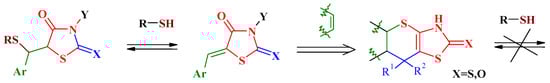 - Kaminskyy, D.; Vasylenko, O.; Atamanyuk, D.; Gzella, A.; Lesyk, R. Isorhodanine and thiorhodanine motifs in the synthesis of fused thiopyrano[2,3-d][1,3]thiazoles. Synlett 2011, 10, 1385–1388. [Google Scholar] [CrossRef]