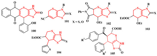 Study of antituberculosis activity of thiopyranothiazoles allowed identifying a hit-compound 11-(2-hydroxyphenyl)-3,11-dihydro-2H-benzo[6,7]thiochromeno[2,3-d]thiazol-2,5,10-trione 100 with promising antimycobacterial activity (MIC90 0.6 µg/mL, Mycobacterium tuberculosis H37Rv strain) and low in vivo toxicity profile [17]. In general, antimicrobial, antifungal and antimycobacterial profiles were among the first types of biological activities described for the thiopyranothiazoles (Figure 5). In particular, in the screening of structurally simple thiopyrano[2,3-d]thiazoles using the disk-diffusion method moderate/high antimicrobial and antifungal activities against Pseudomonas lachrymans, Erwinia toxica, Penicillium simplex, Ulocladium chertorium and Aspergillus oryzae were identified for the derivatives 101 and 102. Moreover, derivatives of the structure 103 inhibited growth of Mycobacterium sp. [39]. Study of a series of 5-(2-thienyl)methylene-4-thioxo-2-thiazolidinones and their condensed analogs resulted in identifying of potent active compound 6-carboxy-7-(2-thienyl)-tetrahydrothiopyrano-7H-[2,3-d]thiazole 104, which had shown besides antimicrobial (against B. Subtilis) and antituberculous activities high antifungal potential (Figure 5) [61,62]. Significant influence on Staphylococcus aureus, Bacillus subtilis and Candida albicans was identified for the rel-(5R,6S,7R)-6-benzoyl-7-phenyl-2-oxo-3,5,6,7-tetrahydro-2H-thiopyrano[2,3-d] thiazole-5-carboxylic acids 105 [28].