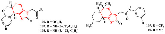 One of the most popular and promising directions of the fused 4-thiazolidinone derivatives investigation is the search for anticancer agents. However, unlike monocyclic 4-thiazolidinones, the mechanism of their antitumor activity is not well understood yet. Moreover, quite often, biophore fragments of the active 4-thiazolidinone derivatives save their pharmacological effect in the new polycyclic scaffold. The latter may be considered as an argument in favour of the given class of compounds as a source of «small drug-like molecules», in particular anticancer agents. Thus, among fused polycyclic thiazolothiopyranes a large number of compounds characterized by the high inhibition rates and/or cytostatic activity towards cell lines of leukemia, non-small cell lung cancer, renal cancer, melanoma, ovarian cancer, breast cancer, prostate and CNS cancer were identified. A series of N-substituted chromeno[4′,3′:4,5]thiopyrano[2,3-d]thiazoles revealed sufficiently high level of growth inhibition of different cancer cells with the avarage logGI50 values from −4.49 to −6.22 in the in vitro studies (Figure 6). The most active were compounds with the ester-106, N-trifluoromethylphenyl- and 3,4-dichlorophenyl-acetamide fragments (107,108) in the molecules that were characterized by the cytostatic effects against a panel of cancer cell lines. On the other hand, 4-methylphenylacetamide substituent in the N3 position of tetracycle increased its selective activity against leukemia cell lines, which was observed at submicromolar concentrations (logGI50 = −6.93 for CCRF-CEM and < −8.00 for HL-60(TB)), whilst its inhibition activity against other cancer cells turned out to be relatively low [55]. Interestingly that structurally related fused system of isothiochromeno[3,4-d]thiazole (Figure 6) with 3-trifluoromethylphenylacetamide 109 and 3-methylphenylacetamide 110 substituents in the N3 position had also showed high antitumor effects along with low acute cytotoxicity levels [54,56].