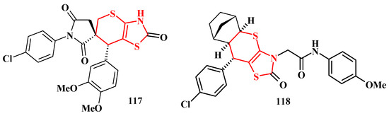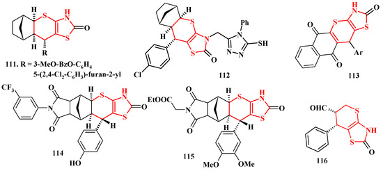 One of the chemical modification directions of thiopyranothiazoles is the introduction of norbornane fragment in the molecules (Figure 7). Thus, thopyranothiazole systems of type 111 with 4-benzyloxy-3-methoxyphenyl- and 5-(2,5-dichlorophenyl)-furan-2-yl substituents in the 9th position of the main core inhibited cancer cell growth at submicromolar concentrations [15]. Structurally related N-substituted 9-aryl(heteryl)-3,7-dithia-5-azatetracyclo[9.2.1.02,10.04,8] tetradecen-4(8)-one-6 112 being moderately active towards a panel of cancer cell lines, showed rather good growth inhibition against leukemia cell lines [63]. Further modification of the main thiopyranothiazole scaffold allowed synthesis of the derivatives with naphthoquinone fragment 113. The latter showed high level of anticancer activity with moderate selectivity towards melanoma cells. It is worth mentioning that 11-substituted benzo[6,7]thiochromeno[2,3-d]thiazole-2,5,10-triones had also antituberculosis activity (compound 98, Figure 5) and low acute toxicity [17]. High anticancer activity was identified in the row of 3,7-dithia-5,14-diazapenthacyclo[9.5.1.02,10.04,8.012,16]heptadecenes. The most active were the hit-compounds 114 and 115, herewith 114 selectively inhibited growth of leukemia cell lines CCRF-CEM (Log GI50 = −6.40) and SR (Log GI50 = −6.06) [16]. 7-Phenyl-2-oxo-7-phenyl-3,5,6,7-tetrahydro-2H-thiopyrano[2,3-d]thiazole-6-carbaldehyde 116 showed high level of antimitotic activity against leukemia with mean GI50/TGI values 1.26/25.22 μM [31].