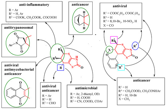 Summarising all the above, fused thiopyranothiazoles can be used as a source for new antibacterial as well as antiviral agents. They also inhibited parasites growth. These results correlate with established anticancer profiles of the thiopyranothiazoles. Moreover, such fused heterocycles can be investigated as potent non-steroidal anti-inflammatory agents. Some structure-activity relationships are outlined in the Figure 9.