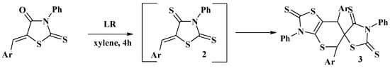 It is important to note that thionation of 5-arylidene-3-phenylrhodanines with the Lawesson’s reagent in the xylene medium can result in the formation of thione’s dimers 3, due to the spontaneous [4+2]-cycloaddition reaction of the intermediate 5-arylidene-2,4-thiazolidinedithiones 2 (Scheme 2). The mentioned synthesis leads to the formation of thiorhodanine spiro-substituted thiopyrano[2,3-d]thiazoles 3 with high yields and the absence of by-products [24].