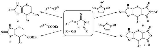 2.1. Utilization of 5-Arylidene-4-Thiazolidinethiones in the Hetero-Diels–Alder Reactions