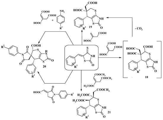 The reaction of 5-arylideneisorhodanines with trans-aconitic acid proceeds as a regio- and diastereoselective [4+2]-cycloaddition with spontaneous decarboxylation of the adduct 18 to furnish rel-(6R,7R)-diastereomers 19. The same products were synthesized using itaconic acid as dienophile. Interestingly that one-pot three-component reaction of 5-arylideneisorhodanines, trans-aconitic acid and anilines diastereoselectively yielded rel-(5′R,6′R,7′R)-spiro[pyrrolidin-3,6′-thiopyrano[2,3-d]thiazol]-2,2′,5-triones 20 [33,34] without decarboxylation of adducts. The thiopyrano[2,3-d]thiazoles 20 were contrary synthesized using (2,5-dioxo-1-arylpyrrolidin-3-ylidene)-acetic acids as dienophiles. It should be noted that unlike free trans-aconitic acid or its imides, corresponding trimethyl ester (trimethyl 1-propene-1,2,3-tricarboxylate) reacted with 5-arylideneisorhodanines with opposite regioselectivity resulting [4+2]-cycloadducts (21) (Scheme 6) [33].