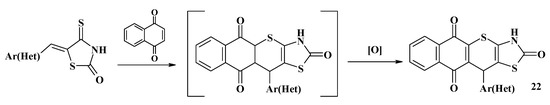 In the case of 1,4-naphthoquinone utilization as dienophile intermediates of the [4+2]-cycloaddition reaction undergo spontaneous oxidation with the formation of tetracyclic thiopyrano[2,3-d]thiazoles 22 (Scheme 7) [17].