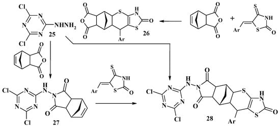 For the diversification of thiopyranothiazoles bearing norbornane moiety (4,6-dichloro-1,3,5-triazin-2-yl)-hydrazine 25 was used to obtain fused thiopyrano[2,3-d]thiazoles 28 via two alternative methods (Scheme 9). One way involved obtaining compounds 26 in hetero-Diels-Alder reaction of 5-arylidene-4-thioxo-2-thiazolidinones with bicyclo[2.2.1]hept-5-ene-2,3-dicarboxylic anhydride (endic anhydride) followed by the condensation with triazinelhydrazine in toluene medium and presence of thionyl chloride. Whilst the other way includes condensation of triazine with endic anhydride in DMF medium at 110 °C firstly and then the reaction of 4-(4,6-dichloro-1,3,5-triazin-2-ylamino)-4-azatricyclo[5.2.1.02,6]dec-8-ene-3,5-dione 27 with 5-arylidene-4-thioxo-2-thiazolidinones yielding corresponding [4+2]-cycloaddition products 28 [36].