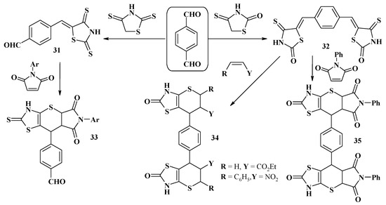 N.H. Metwally and colleagues [38] had chosen terephthalic aldehyde, thio- and isorhodanines as starting reagents in order to investigate the peculiarities of the hetero-Diels–Alder reaction. On the basis of these starting reagents monoarylidene thiorhodanine 31 and bicyclic arylidene isorhodanine derivatives 32 were prepared in the Knoevenagel condensation and than used as heterodienes. Phenyl maleinimide, ethyl acrylate and ω-nitrostyrene were used as dienophiles that enabled syntheses of the compounds 33–35 (Scheme 11).