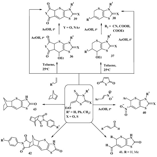 5-Alkylidene-4-thiazolidinediones are useful and important reagents in the search for biological active compounds, as they allow obtaining thiopyrano[2,3-d]thiazole derivatives with relatively low molecular weight. Among them 5-ethoxymethylideneisorhodanine and corresponding thiorhodanine are the most interesting and effective heterodienes that significantly expanded structural diversity of thiopyrano[2,3-d]thiazoles (Scheme 12). In the early works [18,39] dedicated to this issue a number of specific features of mentioned 4-thiazolidinethiones in hetero-Diels–Alder reaction were experimentally established and outlined. In particular, [4+2]-cycloaddition of 5-ethoxymethylideneiso- and thiorhodanines with appropriate dienophiles in the toluene medium at room temperature passes as a classical hetero-Diels–Alder reaction with the formation of 7-ethoxy-3,5,6,7-tetrahydro-2H-thiopyrano[2,3-d]thiazoles 36,37. When changing the reaction medium to the acetic acid and heating the reaction mixture, elimination of the ethanol molecule with the formation of an additional double bond and the corresponding 3,5-dihydro-2H-thiopyrano[2,3-d]thiazoles 38–40 is observed. Analogous pattern was observed in the [4+2]-cycloaddition with acrolein, crotonic aldehyde, 2-norbornene and 5-norbornene-2,3-dicarboxylic acid imides in the medium of acetic acid that allowed obtaining heterocyclic aldehydes 41 and polycyclic heterosystems 42,43 [40].