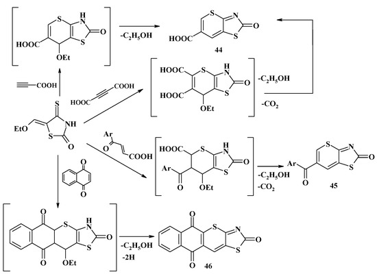Interaction of 5-ethoxymethylene-4-thioxo-2-thiazolidinones with propiolic acid is accompanied by not only the elimination of ethanol, but the rearrangement of double bonds with the formation of 2-oxo-2H-thiopyrano[2,3-d]thiazole-6-carboxylic acid 44. The compound 44 is also formed when using acetylene dicarboxylic acid as dienophile that may be explained by the similar transformation of [4+2]-cycloadduct and additional decarboxylation in the 5th position. [4+2]-Adducts of aroylacrylic acids and 5-ethoxymethylideneisorhodanine also undergo elimination of ethanol and decarboxylation with regioselective formation of 6-aryl-2-oxo-3,5-dihydro-2H-thiopyrano[2,3-d]thiazolyl-6-methanones 45. At the same time, interaction with the 1,4-naphthoquinone was accompanied by spontaneous intermediate dehydrogenation with the formation of additional endocyclic double bond and elimination of the ethanol molecule yielding 5,10-dihydro-2H-benzo[6,7]thiochromeno[2,3-d][1,3]thiazole-2,5,10-trione 46 (Scheme 13) [40].