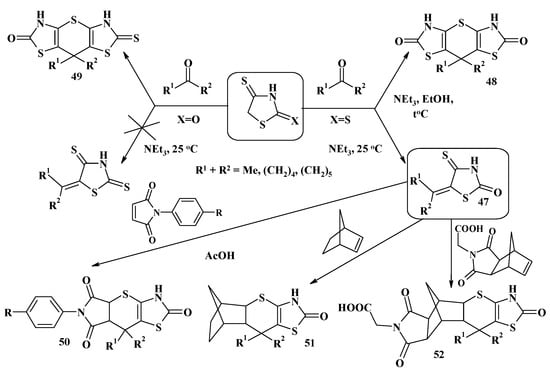 One of the relatively new areas in thiopyrano[2,3-d]thiazole chemistry is the usage of 5-(cyclo)alkylideneisorhodanines as key reagents in [4+2]-cycloaddition (Scheme 14). Thus, the initial heterodienes 47 were obtained in the reaction of isorhodanine with acetone, cyclopentanone or cyclohexanone at room temperature and in the presence of triethylamine as catalyst. Interestingly, performing the reaction in ethanol medium at the solvent boiling point leads to the formation of tricyclic heterosystems 48. When thiorhodanine is used, only condensed derivatives 49 are formed regardless of the reaction conditions. [4+2]-Cycloaddition of 5-(cyclo)alkylideneisorhodanines with arylmaleinamides, 2-norbornene and (3,5-dioxo-4-azatricyclo[5.2.1.02,6]decen-8-yl-4)-acetic acid [36] yielded low molecular thiopyrano[2,3-d]thiazoles 50–52 [41].
