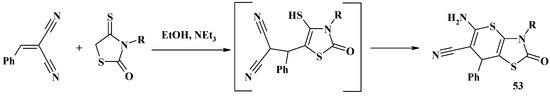 The Michael reaction is one more effective approach to the synthesis of thiopyrano[2,3-d]thiazoles (Scheme 15). Thus, the interaction of arylmethylene malononitrile and 3-substituted isorhodanines in the medium of absolute ethanol at the presence of triethylamine gave 5-amino-2-oxo-7-phenyl-3,5,6,7-tetrahydro-2H-thiopyrano[2,3-d]thiazole-6-carbonitriles 53 [42].