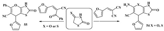 F.M. Abdelrazek and coauthors have used the above approach for the synthesis of pyrano[2,3-d]thiazoles and their thioanalogs (Scheme 16) [43]. The reaction of isorhodanine with 2-(furan-2-yl)-methylenemalononitrile yields thiopyrano[2,3-d]thiazole-6-carbonitrile 54 (X=S), and when 2,4-thiazolidinedione is used pyrano[2,3-d]thiazole 54 (X=O) is formed. Interestingly, 2-benzoyl-3-(furan-2-yl)-acrylonitrile in the Michael reaction with 2,4-thiazolidinedione or isorhodanine, at the elimination of water or hydrogen sulphide respectively forms the same compound—7-(furan-2-yl)-2-oxo-5-phenyl-3,7-dihydro-2H-pyrano[2,3-d]thiazole-6-carbonitrile 55.