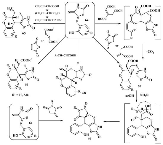 Thus, when studying hetero-Diels–Alder-acylation tandem reactions of 5-(2-hydroxyphenylmethylidene)isorhodanines 64 with unsaturated carboxylic acids and their derivatives more precisely, a number of stereochemical peculiarities of these processes were established (Scheme 22). For example, in the reaction of crotonic acid, its amides or anhydride a mixture of rel-5R,5aR,11bS and rel-5S,5aR,11bS diastereomers (65) were formed; the isomers’ ratio depends on the nature of dienophile and the reaction temperature [26]. The reaction of heterodiene 64 with maleic and fumaric acids and their derivatives (maleic anhydride, esters) passed diastereoselectively [46,47]. Moreover, independently of the stereoisomerism of the dienophile a racemic mixture of rel-(5R,5aR,11bS)-2,6-dioxo-3,5a,6,11b-tetrahydro-2H,5H-chromeno[4′,3′:4,5] thiopyrano[2,3-d]thiazole-5-carboxylic acids derivatives 66 with a cis-Hydrogen in positions 5, 5α, and 11β of heterocyclic systems was formed. Itaconic acid and its anhydride [48,49] as well as trans-aconitic acid [33] reacted in a similar manner forming derivative 67. In the case of trans-aconitic acid the reaction proceeded with spontaneous decarboxylation at position 5 of thiopyrano[2,3-d]thiazole core [33]. rel-(5S,5aR,11bS)-5-Aryl-3,5a,6,11b-tetrahydro-2H,5H-chromeno [4′,3′:4,5]thiopyrano[2,3-d]thiazole-2,6-diones 68 were the products of tandem hetero-Diels–Alder-acylation reaction of 5-(2-hydroxyphenylmethylidene)isorhodanines and cynnamic acids [26]. Compound 67 proved to be effective reagent for the next chemical transformations. The reaction of 67 with primary amines in acetic acid passed through the amidation stage, followed by spontaneous recycling in spiroimides 68. The thiopyrano[2,3-d]thiazoles 68 were also obtained by the alternative method from itaconic acid imides [48].