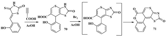 It is important to note that at interaction of 5-(2-hydroxyphenylmetylidene)isorhodanine with propiolic acid, a classic hetero-Diels–Alder reaction takes place to form thiopyrano[2,3-d]thiazole derivative 70. The presence of a double bond at positions 5–6 causes planar structure of the bicyclic fragment and creates the spatial obstacles for acylation of phenolic group. Dehydrogenation of basic heterocycle with bromine in acetic acid removes these obstacles and allows obtaining tetracyclic 2H,6H-chromeno[4′,3′:4,5]thiopyrano[2,3-d]thiazole-2,6-dione 71 (Scheme 23) [26].