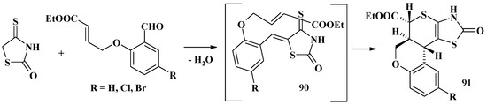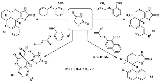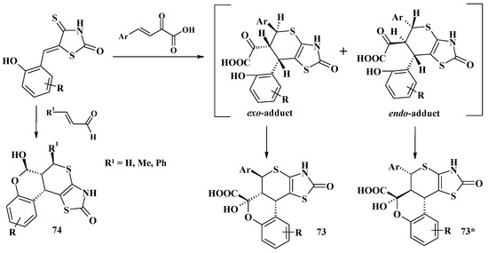 The reactions between 5-(2-hydroxybenzylidene)-4-thioxo-2-thiazolidinones and arylidene pyruvic acids yielded the mixture of rel-(5S,5aR,11bR) 73 and rel-(5R,5aS,11bR) 73* diastereisomers at 2:1 ratio [50]. At the same time acroleine, crotonic and cynnamic aldehydes in mentioned tandem hetero-Diels-Alder-hemiacetal reaction (Scheme 25) diastereoselectively yielded novel rel-(5aR,6R,11bS)-6-hydroxy-3,5a,6,11b-tetrahydro-2H,5H-chromeno[4′,3′:4,5]thiopyrano[2,3-d]thiazole-2-ones 74 [51].